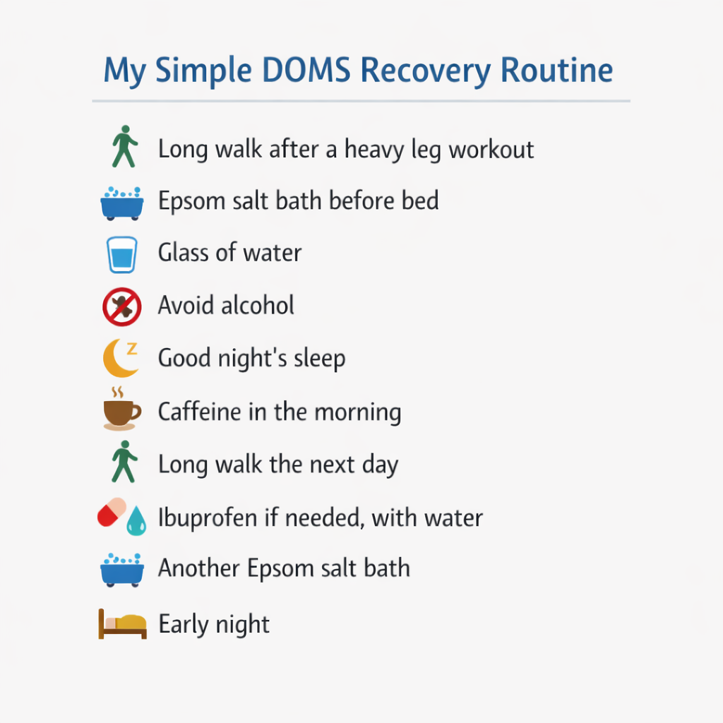 Epsom salt baths are often recommended for DOMS. I’ve tried them myself and can’t say for sure whether they make a direct difference. However, they’re relaxing and tend to improve sleep, which does help recovery, so they’re still worth trying.