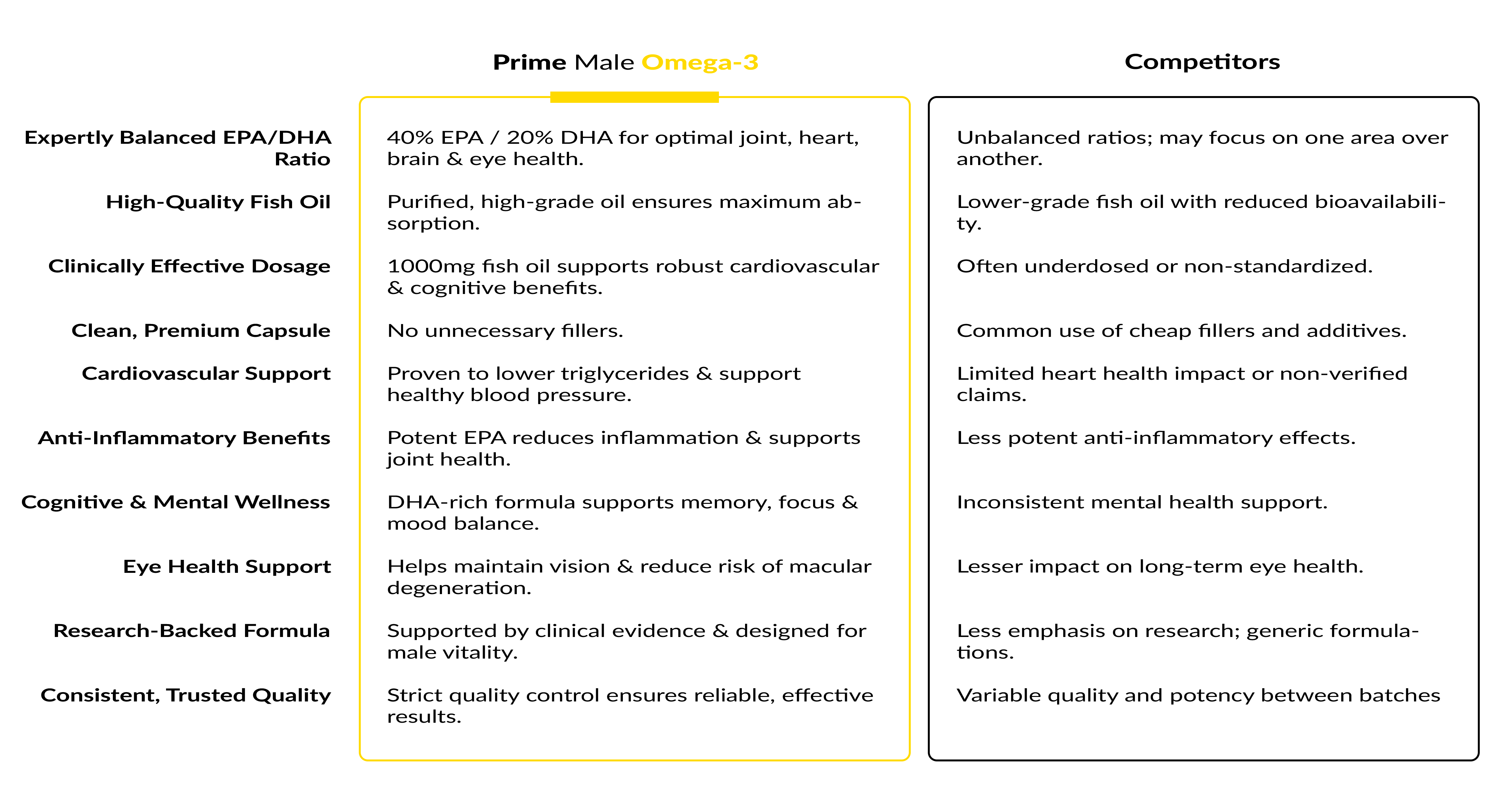 There are many Omega-3 supplements out there, but the quality can vary massively from product to product. At Prime Male, we wanted to create an Omega-3 supplement that men could trust to deliver significant health benefits at a fantastic price.